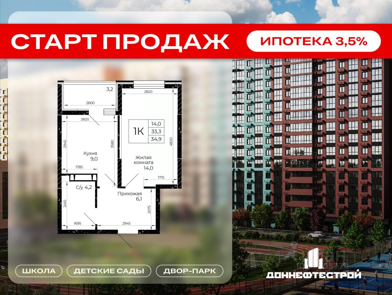 Продаётся 1-комнатная квартира в строящемся доме (Литер 4.2), срок сдачи: IV-кв. 2028, общей площадью 34.9 кв.м., на 11 этаже. Город стремительно развивается. Мы вместе с ним. Инфраструктура города пополняется новыми сервисами и полезными опциями, которые позволяют нам получать всё необходимое рядом с домом. В основе концептуального подхода СК ''ДОННЕФТЕСТРОЙ'' к развитию микрорайона ''Флора'' лежит формирование современного жилого и общественного пространства, интегрированного в живописную экологически благоприятную территорию на площади 30 гектаров. Вместе с жильём создана необходимая социальная, транспортная и коммерческая инфраструктура. В составе ''Флоры'' - два детских сада, трёхэтажная школа, физкультурно-оздоровительный центр, двор-парк с ландшафтным дизайном и фонтан.
