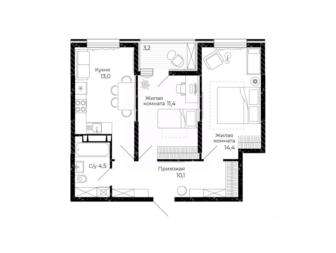Общая площадь55 м2