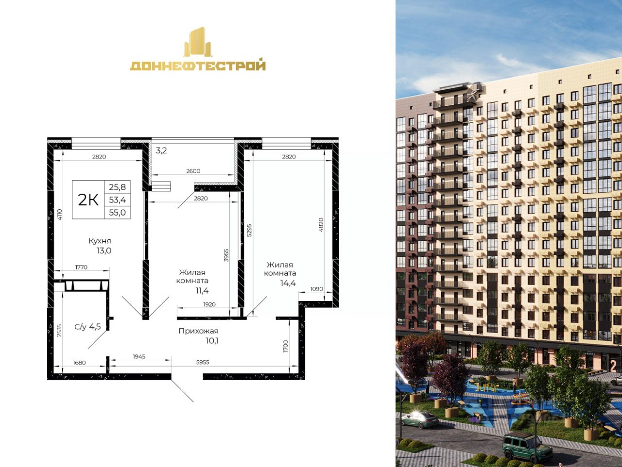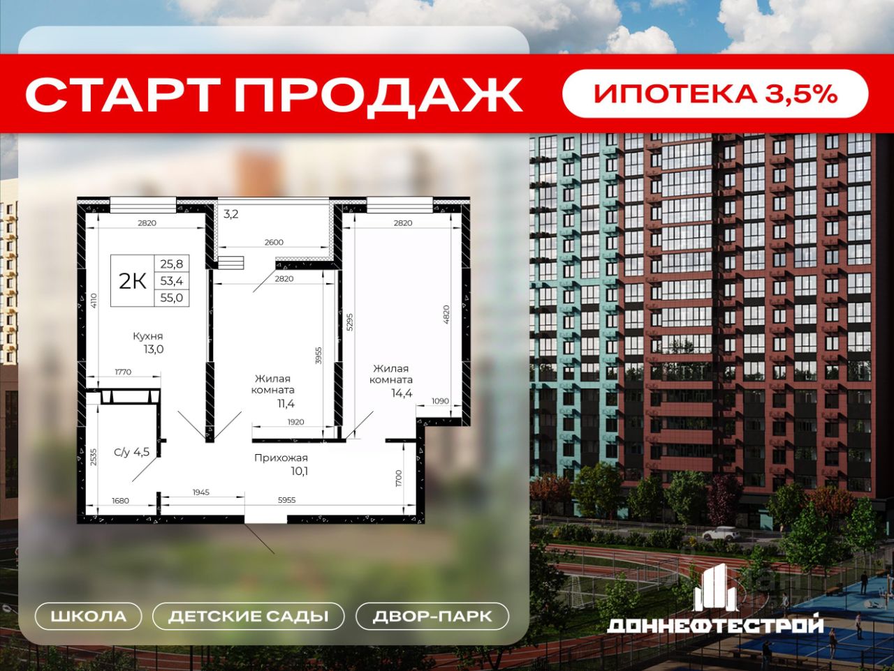 Продаётся 2-комнатная квартира в строящемся доме (Литер 4.1), срок сдачи: IV-кв. 2028, общей площадью 55 кв.м., на 4 этаже. Город стремительно развивается. Мы вместе с ним. Инфраструктура города пополняется новыми сервисами и полезными опциями, которые позволяют нам получать всё необходимое рядом с домом. В основе концептуального подхода СК ''ДОННЕФТЕСТРОЙ'' к развитию микрорайона ''Флора'' лежит формирование современного жилого и общественного пространства, интегрированного в живописную экологически благоприятную территорию на площади 30 гектаров. Вместе с жильём создана необходимая социальная, транспортная и коммерческая инфраструктура. В составе ''Флоры'' - два детских сада, трёхэтажная школа, физкультурно-оздоровительный центр, двор-парк с ландшафтным дизайном и фонтан.