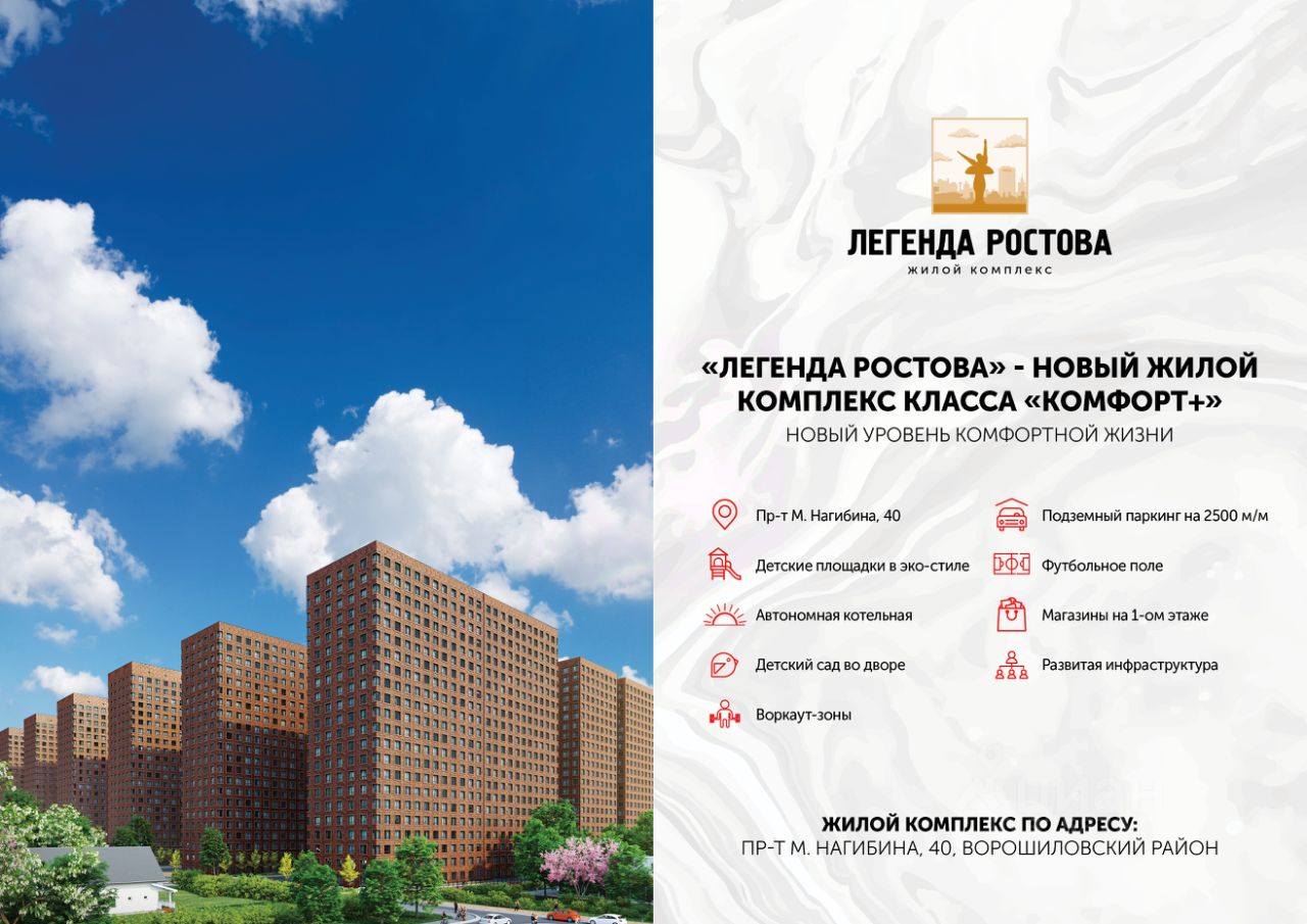 Жилой квартал ''Легенда Ростова'' возводится в Ворошиловском районе, по адресу, пр-кт. им. М. Нагибина,40. В месте, где есть всё необходимое для комфортной жизни в большом современном городе: школы и детские сады, поликлиники и магазины, ТРЦ. Сам проект обладает множеством преимуществ: - Монолитно-каркасная технология строительства. -Облицовка кирпич в соответствии с ГОСТом - Срок ввода в эксплуатацию II квартал 2026 года. - 2 литера по 26 этажей. - 10 минут до центра города. - Рядом роща СКА и ТРЦ ''Горизонт''. - Детский сад во дворе. - Большой выбор планировок. - Закрытая территория комплекса. - Детские-и воркаут-площадки. - Большой подземный паркинг.