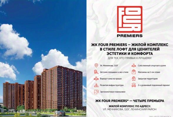 ЖК FOUR PREMIERS это современный жилой комплекс, который располагается в центре города по адресу, ул. Мечникова, 110Г. Данный проект выделяется яркой архитектурой в стиле лофт и множеством других особенностей: