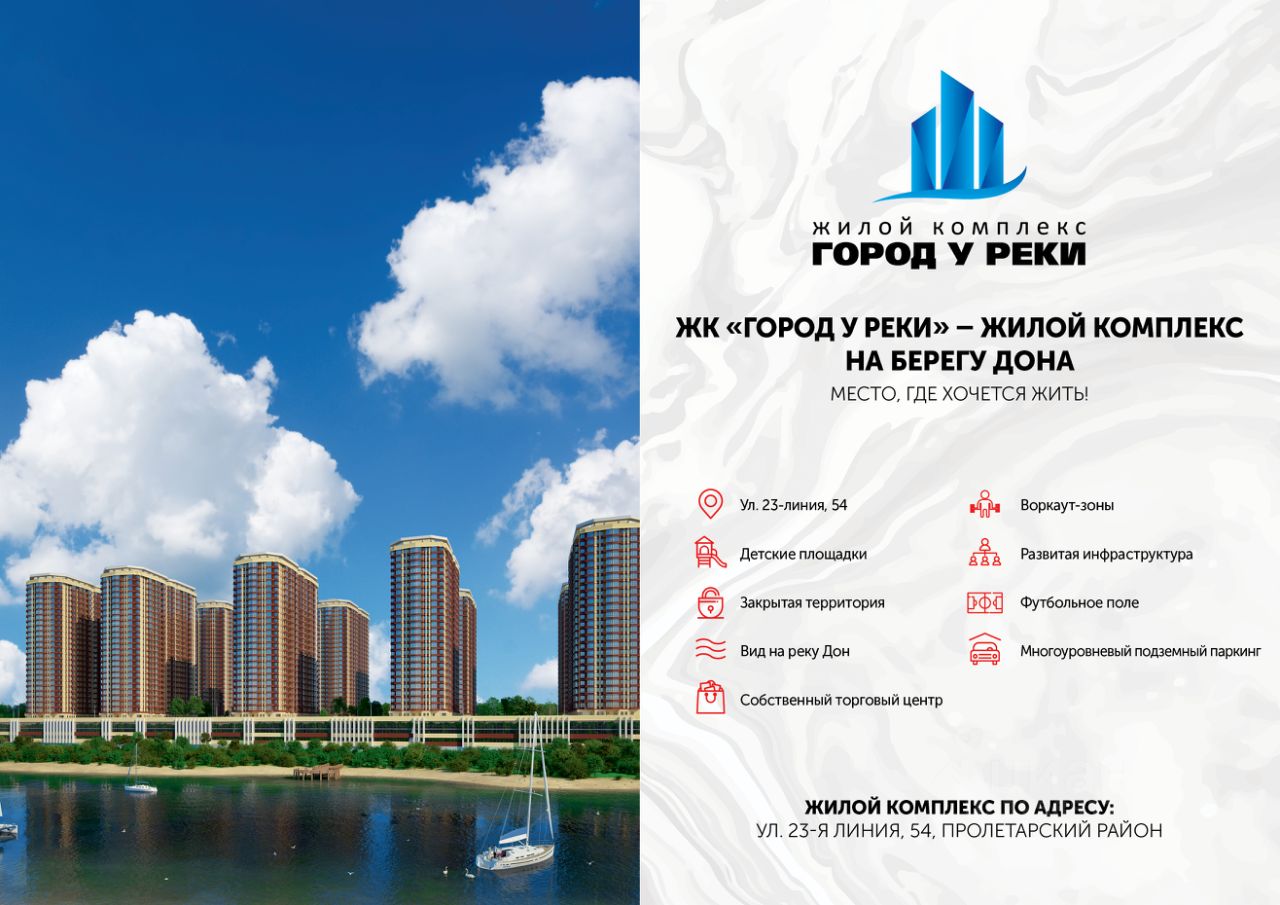 ЖК ''Город у реки'' это масштабный жилой комплекс комфорт-класса с отличной инфраструктурой проекта, которой строится с учётом интересов разных поколений семьи, по адресу, ул. 23-я линия, 54. Подходит всем, кто любит природу и ценит жизнь в городе. - Монолитно-каркасная технология строительства. -Облицовка кирпич в соответствии с ГОСТом. - 7, 8 и 12 литеры введены в эксплуатацию. - 13 литеров 25 этажей. - 5 минут до центра города. - Квартиры с видом на реку. - Рядом понтонный мост на Зеленый остров. - Спортивные и детские площадки. - Подземный паркинг. - Продуманные зоны отдыха. - Детский сад и 6 школ вблизи ЖК.