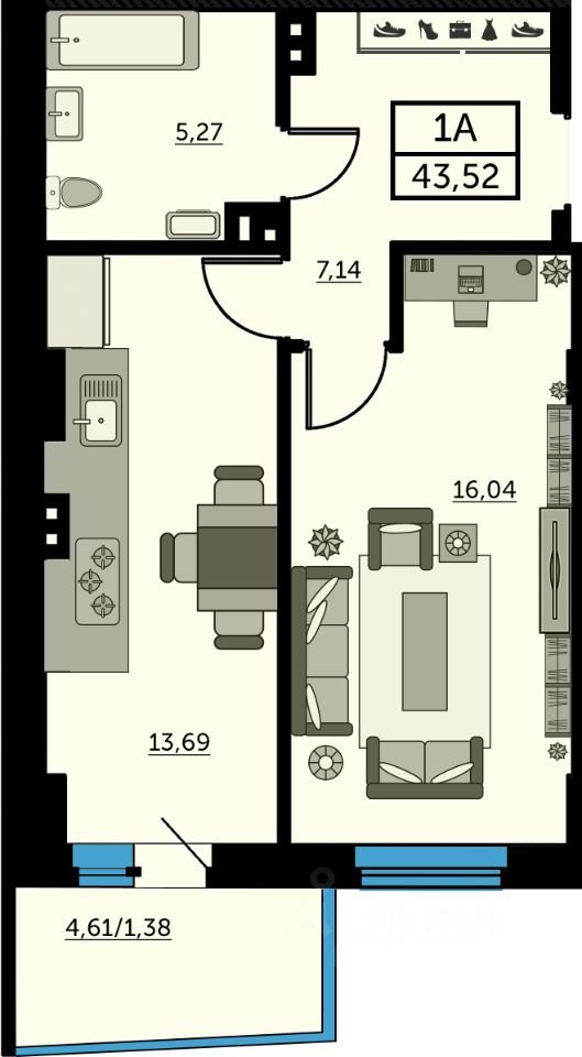 В продаже однокомнатная квартира в новостройке. Лучшее решение для молодой семьи, под сдачу или для инвестиций. Данная планировка с оптимальным размещением помещений. Широкая прихожая достаточно вместительна для хранения вещей. Также в основной комнате выделено место для хранения вещей или рабочей зоны, так, чтобы это дополняло интерьер вашей квартиры. Успейте забронировать квартиру мечты напрямую от застройщика.