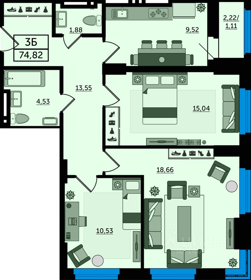 Общая площадь74,82 м2