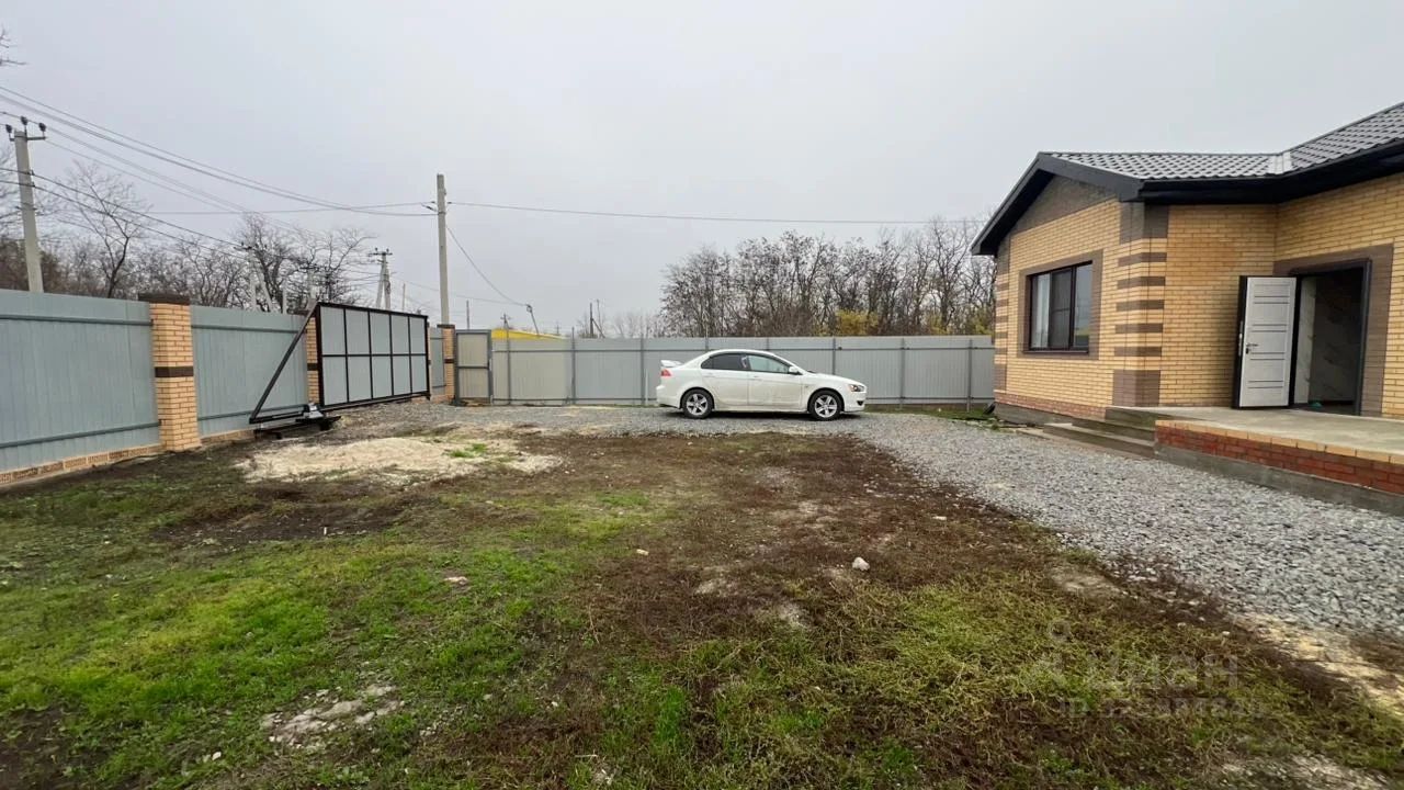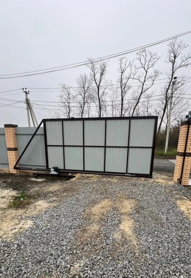 Дом огорожен забором с кирпичными колонами и откатными воротами.