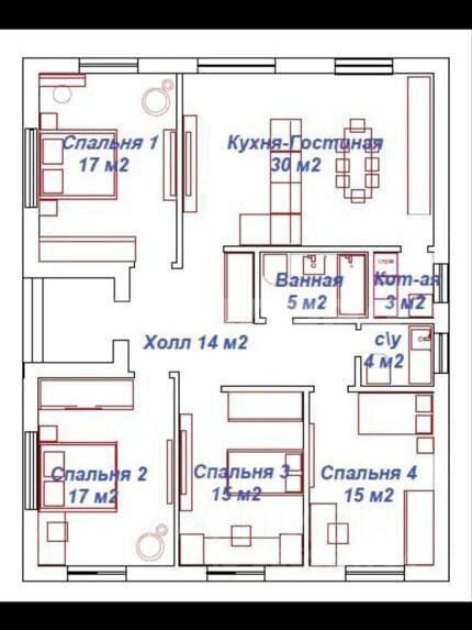 В доме кухня-гостиная с выходом на террасу, 4 спальни, 2 санузла, котельная.