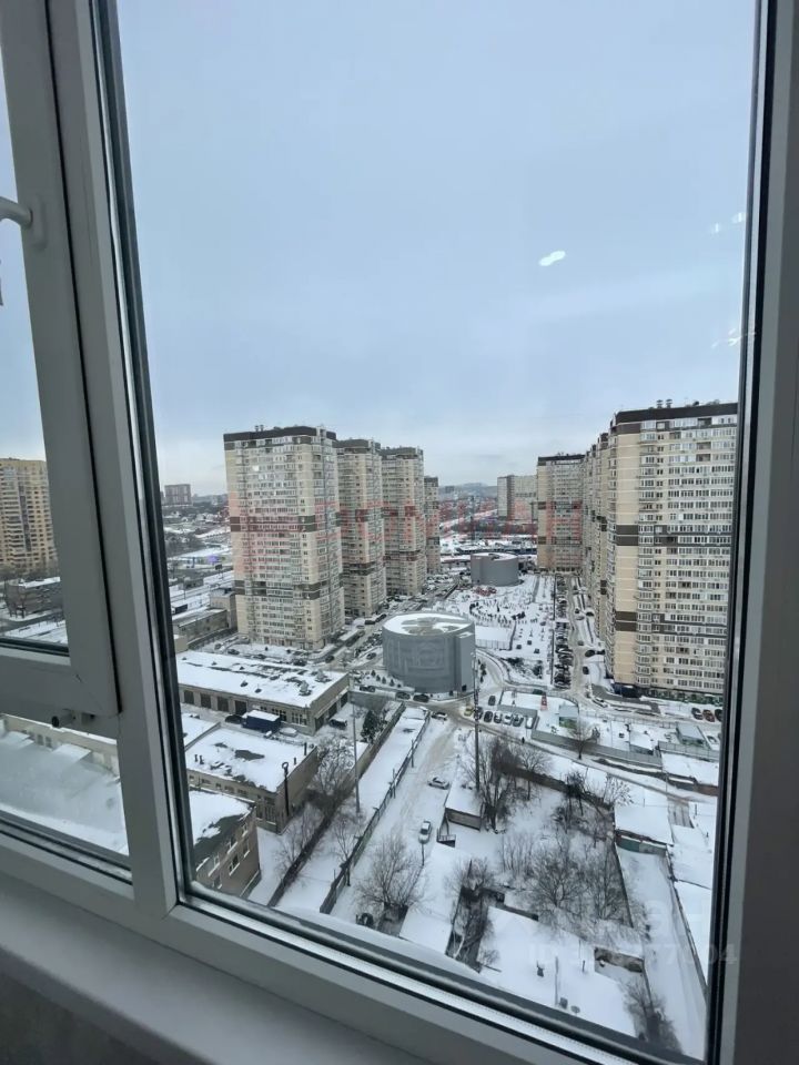 Панорамный вид из окна на город. Три лифта.