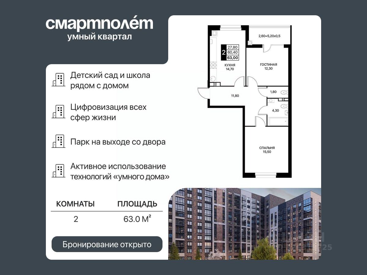 Почему двухкомнатная квартира в ЖК ''Смартполет'' — ваш лучший выбор Надежный федеральный застройщик с гарантией сроков и качества. Выгодная геолокация: центр города рядом, тихая и зеленая зона для жизни. Современная инфраструктура: школы, детсады, поликлиники, магазины, парки. Закрытые дворы и безопасность: видеонаблюдение, приватные пространства. Рост цен на недвижимость: вложение сегодня принесет прибыль завтра. Готовность ключей уже в этом году — заезжайте без ожидания.