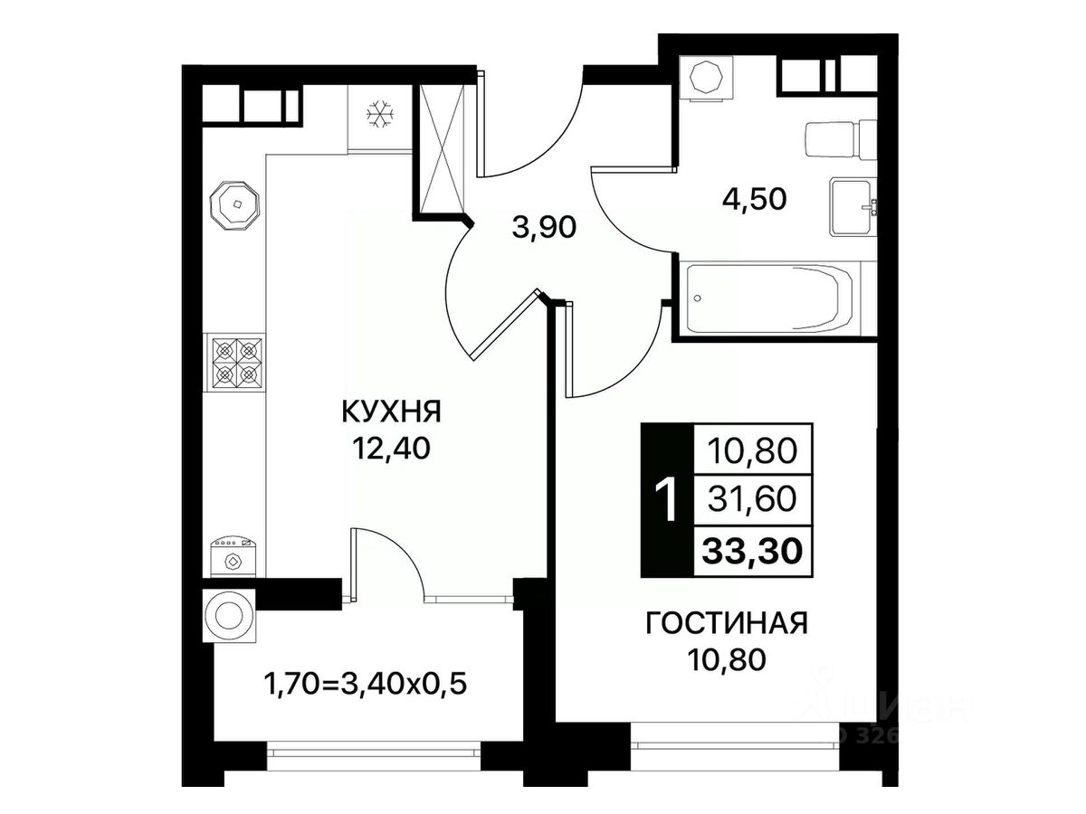 Общая площадь33,3 м2
