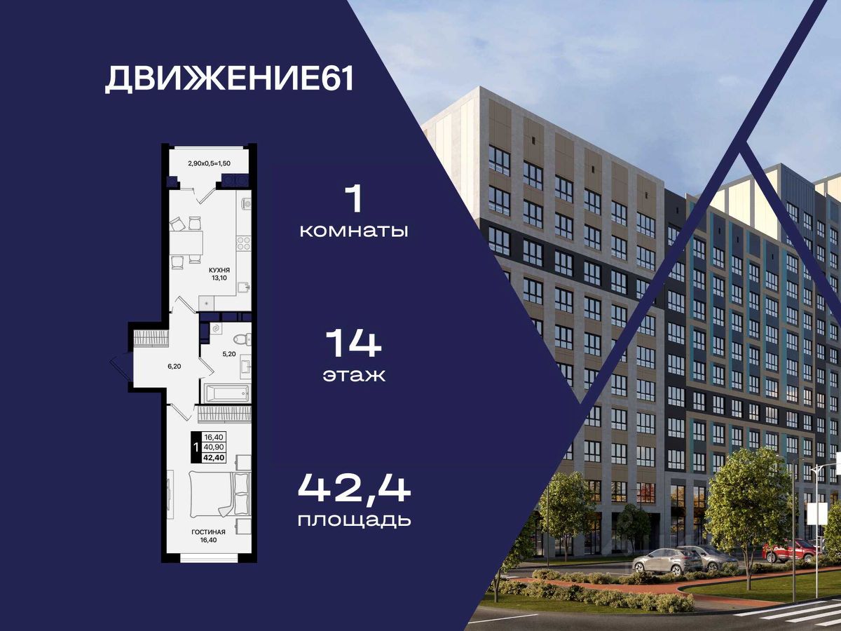 Продается уютная 1-комнатная квартира в новом ЖК ''Движение61'' от надежного федерального застройщика ''ЮгСтройИнвест'' — лидером рынка Юга России.
