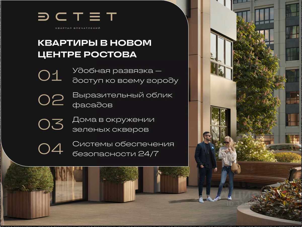 О жилом комплексе ''ЭСТЕТ'': — 7 уникальных зон, каждая со своей идеей и настроением, — Премиальные вентилируемые фасады, — Красивые дизайнерские холлы и продуманные входные группы, — Коммерция на первых этажах: кофейни, магазины, сервисы.