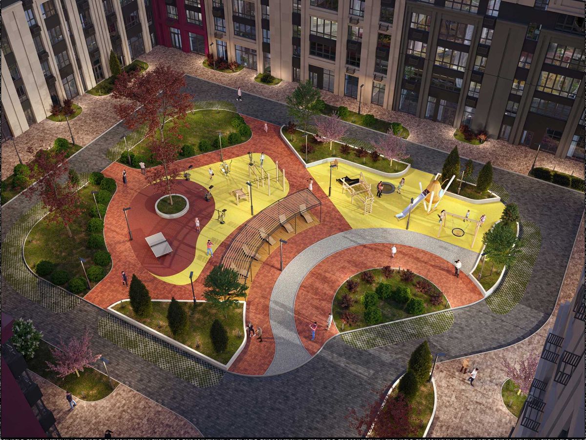 Благоустройство и территория: — Просторные дворы, — Детские площадки, спортивные зоны, воркаут, теннис, — Скейт-парк, ламп-трек и интерактивные игровые площадки, — Аллеи, тематические парки, зоны отдыха, фудкорт, арт-пространства, — Парк ''Импрессионистов'', зона киносеансов, уличная библиотека, — 70% территории — общественные пространства.