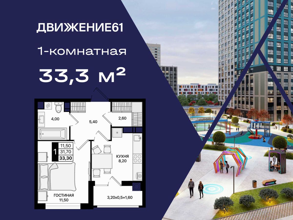 О квартале ''Движение61'': Новая современная локация на участке 21 гектар — территория, где созданы все условия для комфортной жизни: Школа на 900 мест, Детский сад на 400 мест, Широкие зелёные дворы, Спортивные и детские площадки, тренажёры, прогулочные зоны, зелёные рощи — комфорт прямо у подъезда, Подземный паркинг, Коммерция на первых этажах (кофейни, магазины, пункты выдачи).