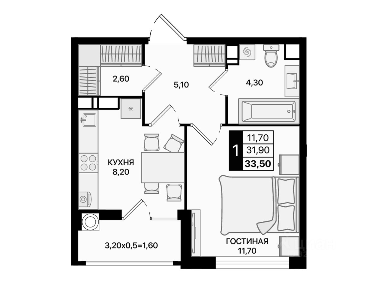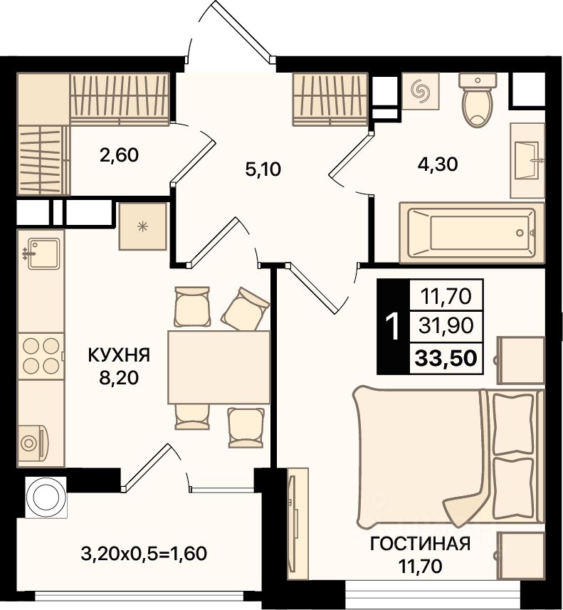 Общая площадь33,5 м2