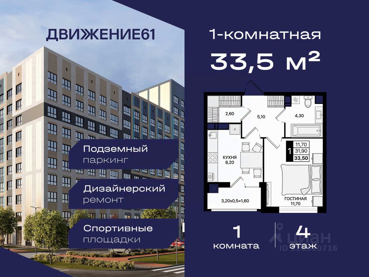 Если вы ищете современную, удобную и доступную квартиру в динамично развивающемся районе — 1-комнатная квартира в ''Движение61'' идеально подходит как для жизни, так и для сдачи в аренду.