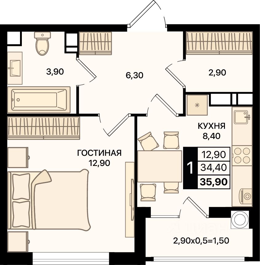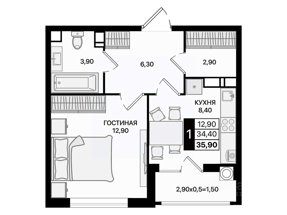 Общая площадь35,9 м2