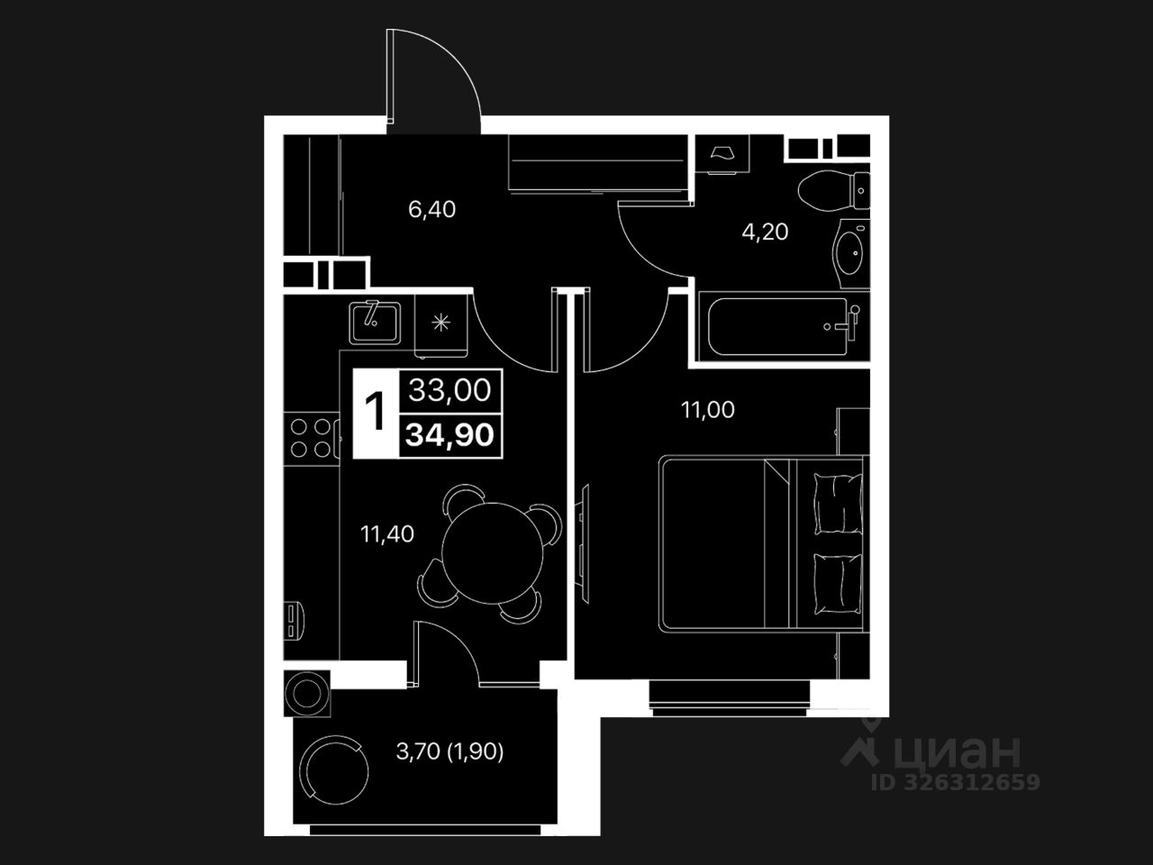 Общая площадь34,9 м2