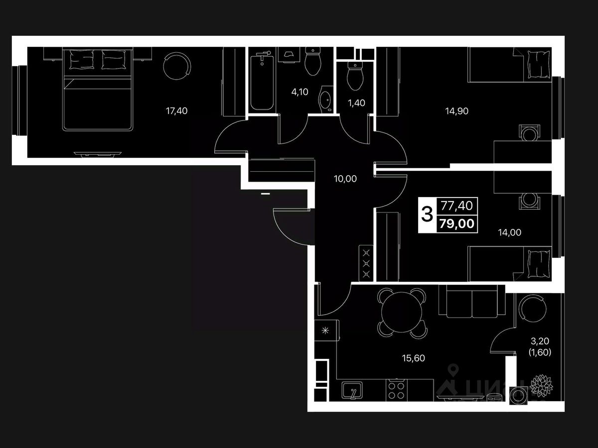 Планировка: Отдельные спальные зоны, Большая гостиная, которую можно объединить с кухней, Ниша под гардеробную, место под рабочий кабинет, Просторная лоджия, Правильная геометрия комнат.