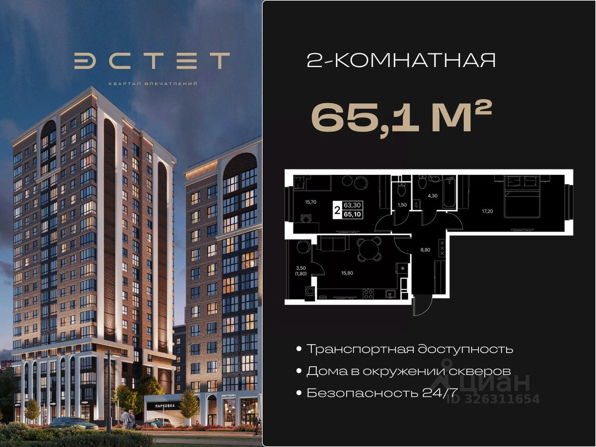 Планировка: Спальня + отдельная кухня-гостиная, Продуманное зонирование: тихая спальная зона, общая гостиная, Большие окна, много естественного освещения, Продуманные ниши под шкафы и гардеробные, Балкон. Уютное пространство, где можно комфортно жить, работать, отдыхать и принимать гостей. О жилом квартале: Главная особенность проекта — комфортная среда, в которой хочется проводить время: Дворы без машин — безопасно и спокойно, Ландшафтные зоны, зеленые маршруты, спортивные и детские площадки, Продуманный свет, камеры наблюдения, закрытая территория, Красивое оформление фасадов и входных групп, Подземный и надземный паркинг с удобным доступом к подъездам.