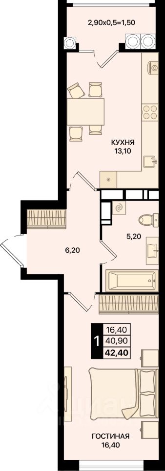Общая площадь42,4 м2