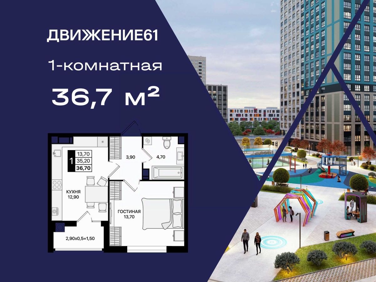 1-комнатная квартира в ''Движение61'' — удобный старт, разумная цена и благоприятный район для жизни!
