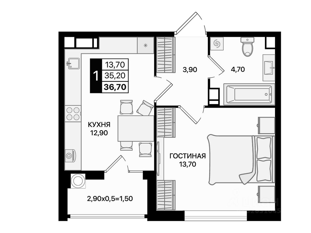 Преимущества: — Отдельная спальня, — Правильные прямые формы комнат, — Большие окна и светлые помещения, — Место под гардероб/хранение.