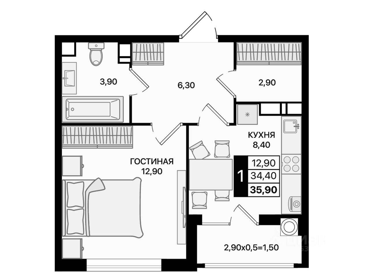 Общая площадь35,9 м2