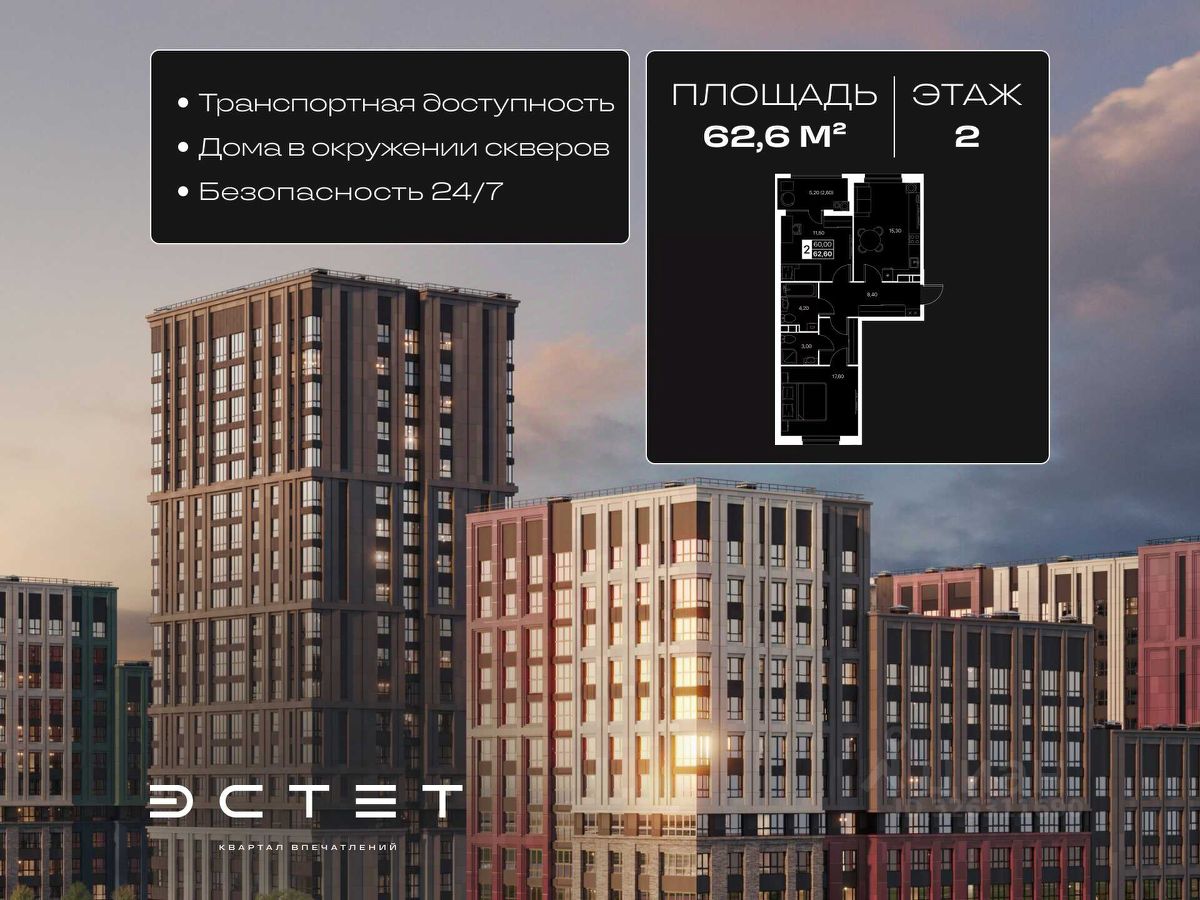 В ЖК Эстет: Безопасная закрытая территория с круглосуточной охраной Двор без машин Современное интеллектуальное освещение Детский сад и школа на территории Паркинг с лифтом до этажа Дизайнерские холлы Всё для активного отдыха, спорта и семейного досуга ДВУХКОМНАТНАЯ КВАРТИРА Идеальный формат для семьи или тех, кто ценит пространство: — Большая кухня-гостиная — Отдельная спальня — Возможность выделить рабочую зону — Тишина, тепло, удобная планировка — Большие окна и много света