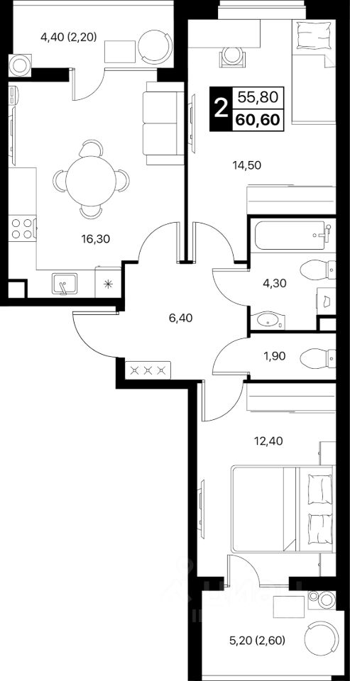 Общая площадь60,6 м2