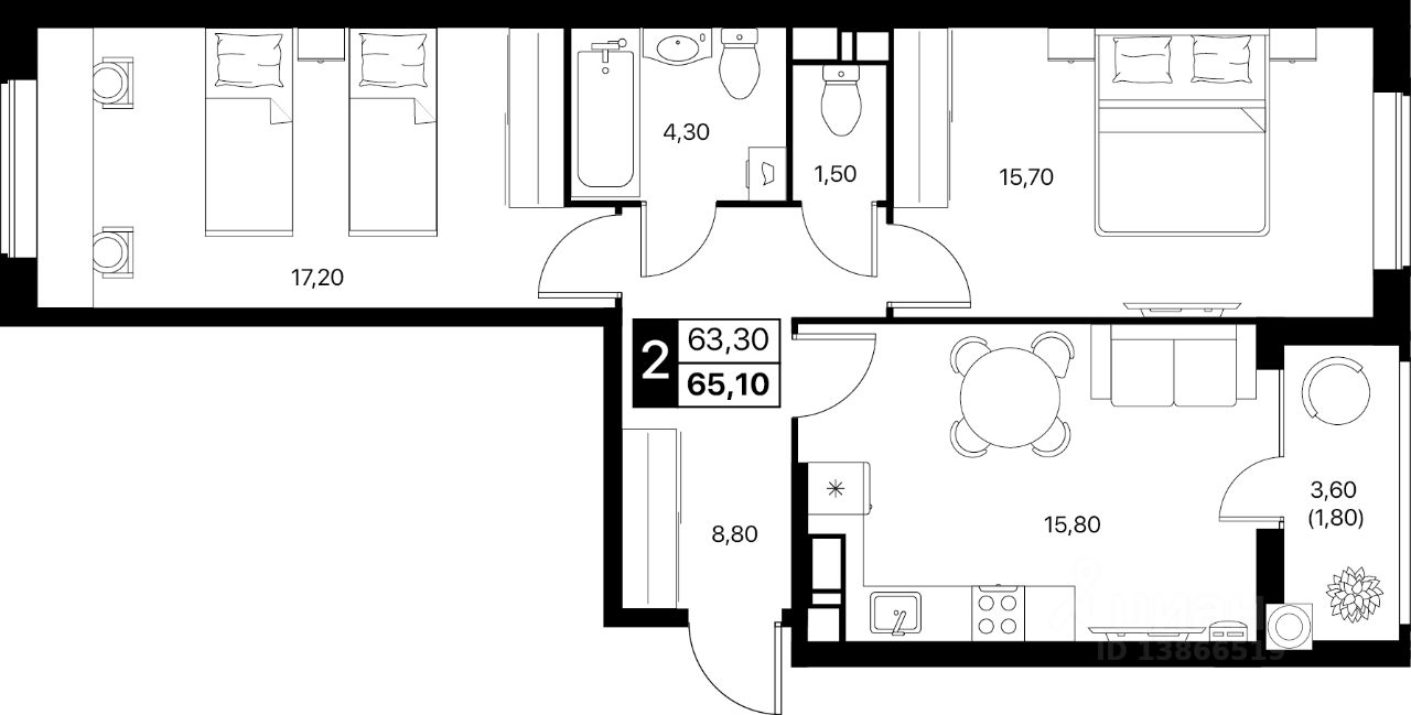 Общая площадь65,1 м2