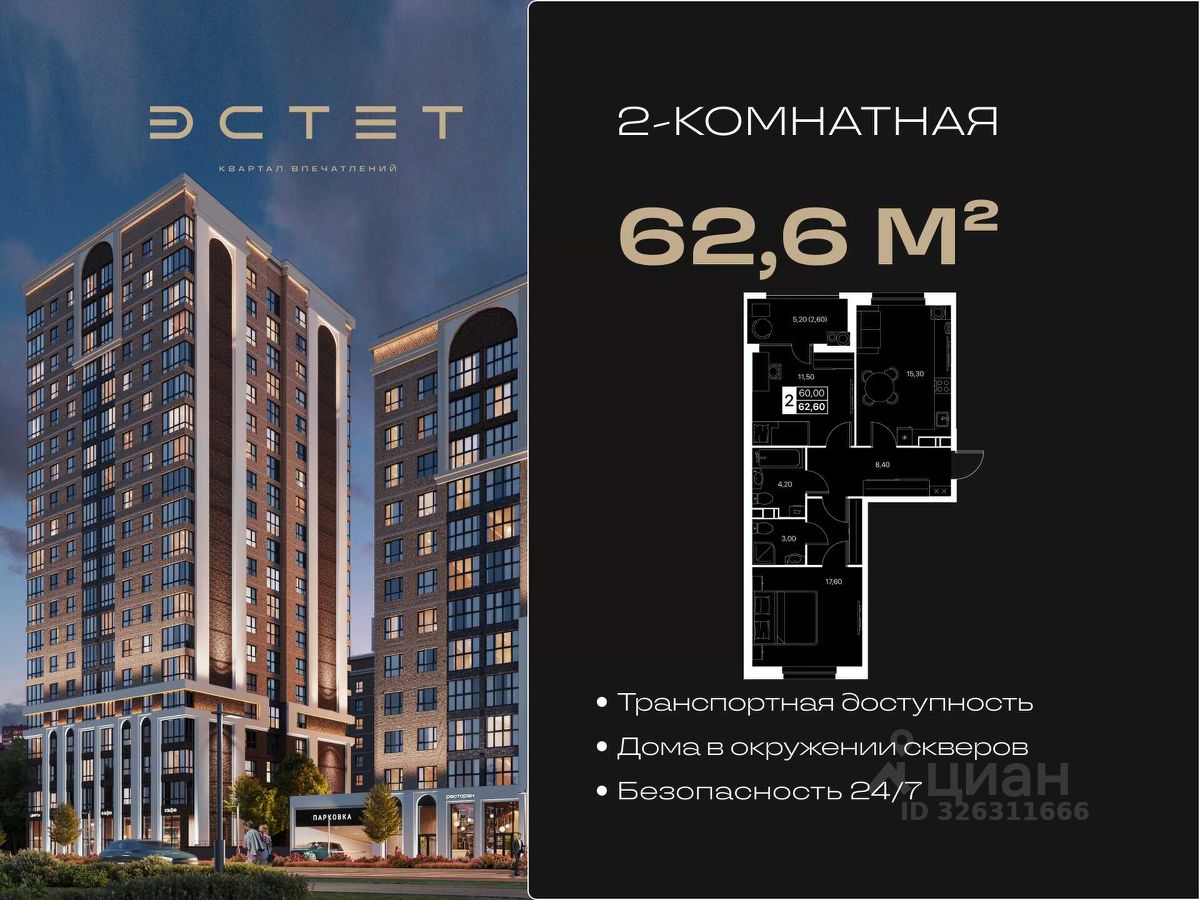 В ЖК Эстет: Безопасная закрытая территория с круглосуточной охраной Двор без машин Современное интеллектуальное освещение Детский сад и школа на территории Паркинг с лифтом до этажа Дизайнерские холлы Всё для активного отдыха, спорта и семейного досуга ДВУХКОМНАТНАЯ КВАРТИРА Идеальный формат для семьи или тех, кто ценит пространство: — Большая кухня-гостиная — Отдельная спальня — Возможность выделить рабочую зону — Тишина, тепло, удобная планировка — Большие окна и много света