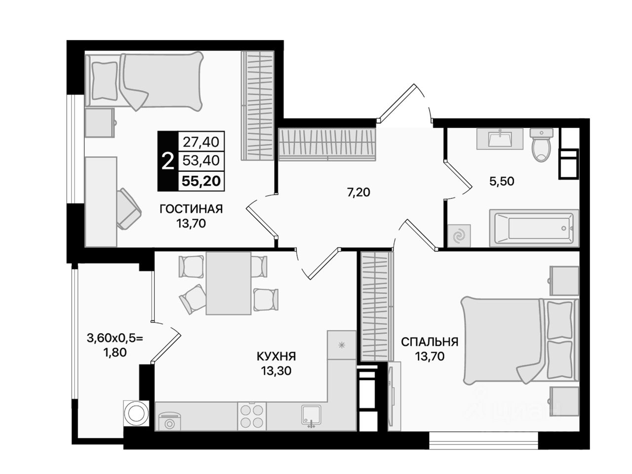 Общая площадь55,2 м2
