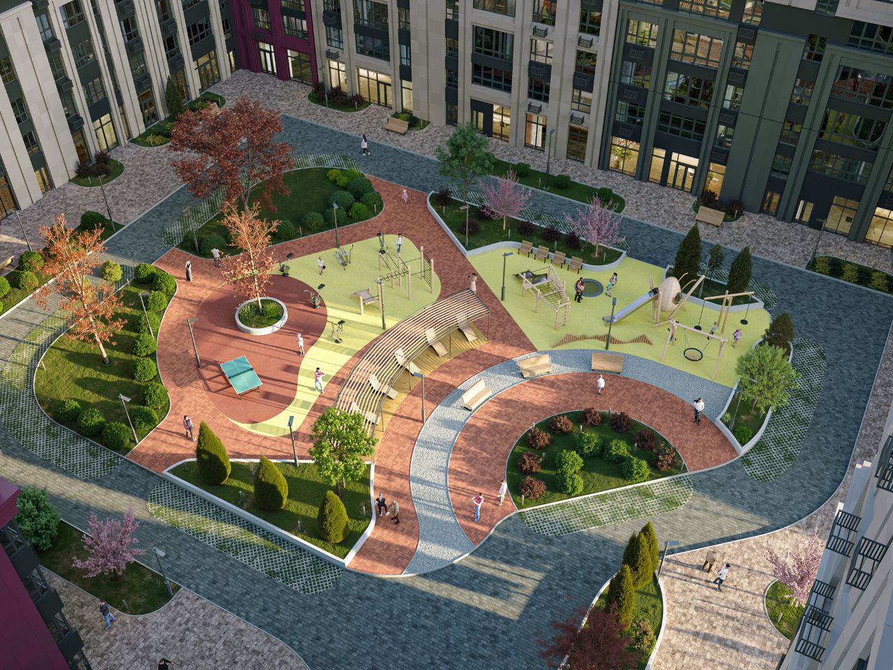 Благоустройство и территория: — Просторные дворы, — Детские площадки, спортивные зоны, воркаут, теннис, — Скейт-парк, ламп-трек и интерактивные игровые площадки, — Аллеи, тематические парки, зоны отдыха, фудкорт, арт-пространства, — Парк ''Импрессионистов'', зона киносеансов, уличная библиотека, — 70% территории — общественные пространства.