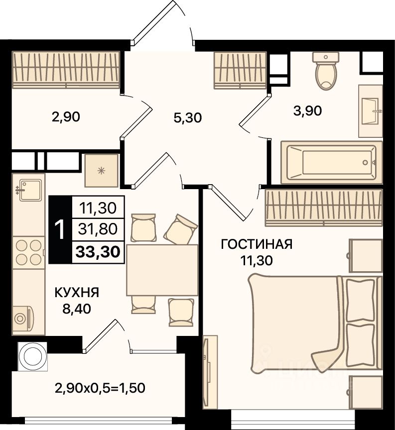 Общая площадь33,3 м2