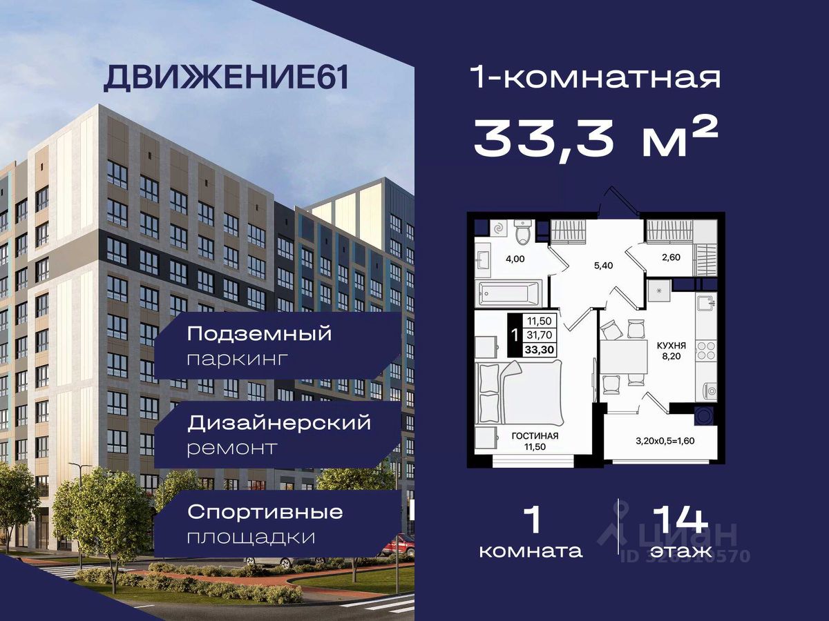 ''ЖК Движение 61'' один из лучших в Ростове! Новый квартал расположен рядом с проспектом Шолохова В пешей доступности — гипермаркет Метро В 3 минутах на авто — зеленая роща в ПКиО ''Мета'' Удобная транспортная развязка — быстрое перемещение по всему городу Новый собственный выезд на проспект — полностью асфальтирован и освещен