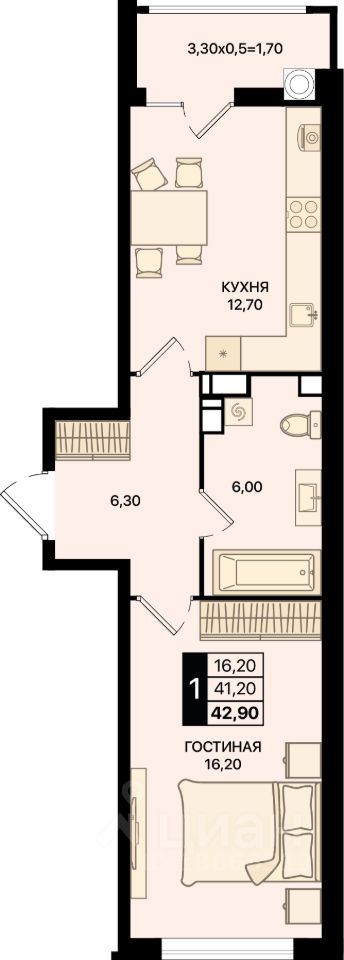 Общая площадь42,9 м2