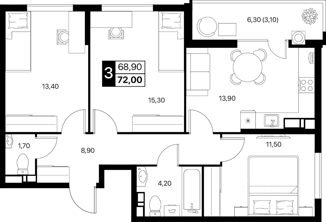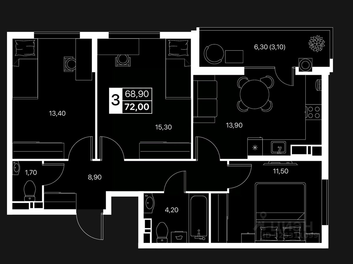 О квартире: — Продуманная 3-комнатная планировка: две отдельные спальни + большая гостиная, — Светлые, просторные комнаты, правильная геометрия, — Легко выделить детскую, кабинет, спальню, — Прекрасно подходит для семей с детьми — у каждого будет свое пространство, — Отличный вариант под инвестиции: семейные форматы всегда востребованы, — Предчистовая отделка — идеально ровные стены и пол под ваш будущий ремонт, — Выполнены стяжка, штукатурка, скрытая электрика, — Установлена металлическая дверь, — Теплые полы в кухне, санузле и прихожей.