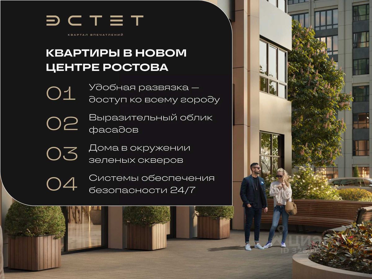 ЖК ''Эстет'' — комфорт, инфраструктура и безопасность Жилой комплекс возводится из современных материалов по монолитно-кирпичной технологии, с высоким уровнем звуко - и теплоизоляции. Что входит: Закрытая, охраняемая территория — двор без машин, видеонаблюдение, контроль доступа. Подземный и гостевой паркинг — удобно владельцам авто. Детские и спортивные площадки, зоны отдыха, прогулочные зеленые территории — комфорт для вас и ваших близких. Продуманное жилое пространство: современные подъезды, колясочные, места для хранения, комфортная инфраструктура для жизни.
