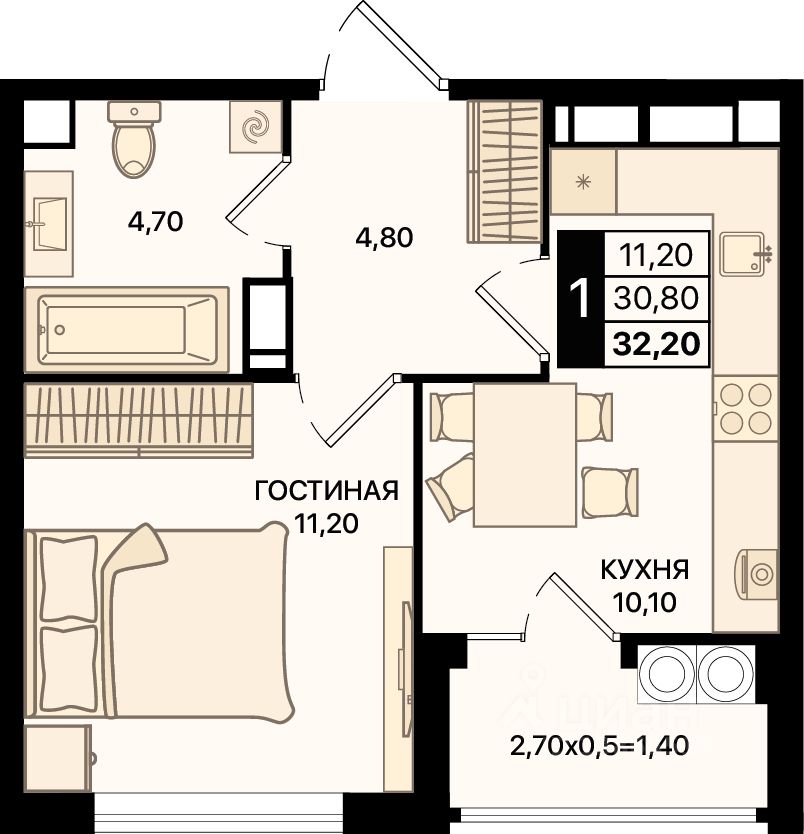 Общая площадь32,2 м2