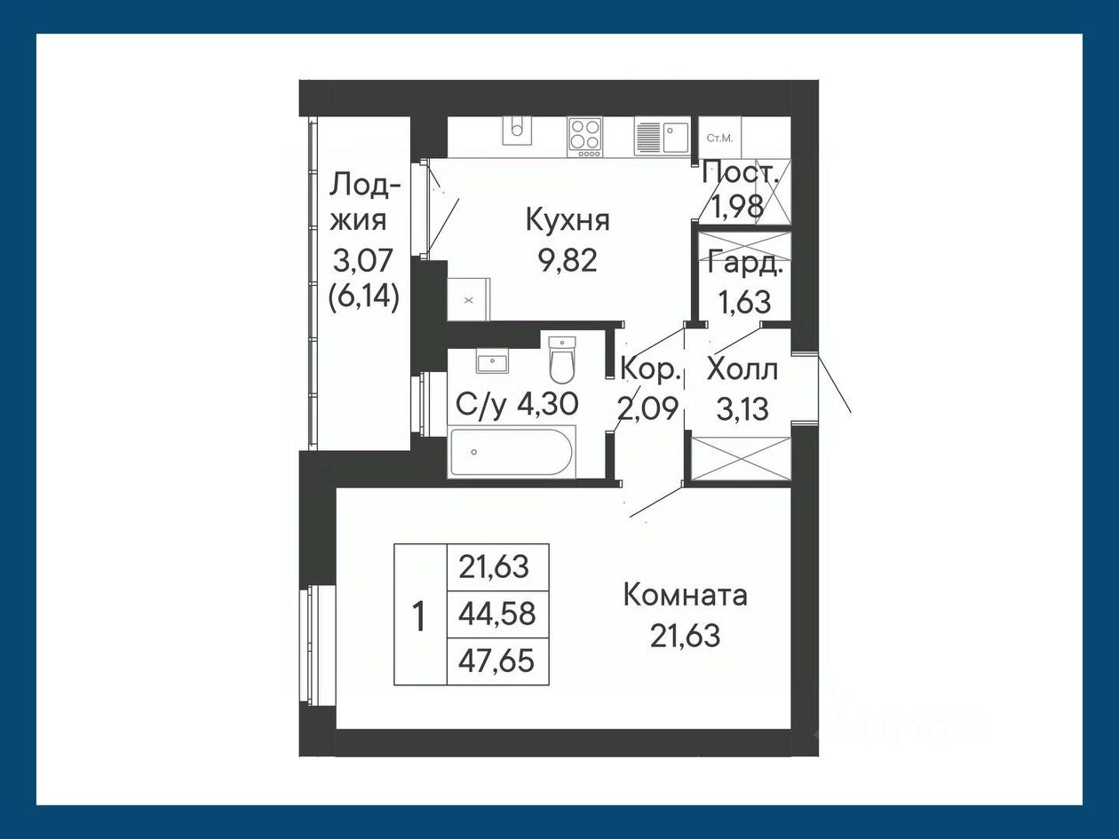 Данное планировочное решение представляет собой уникальный формат однокомнатной квартиры с окнами в ванной комнате и выходом на лоджию из кухни.