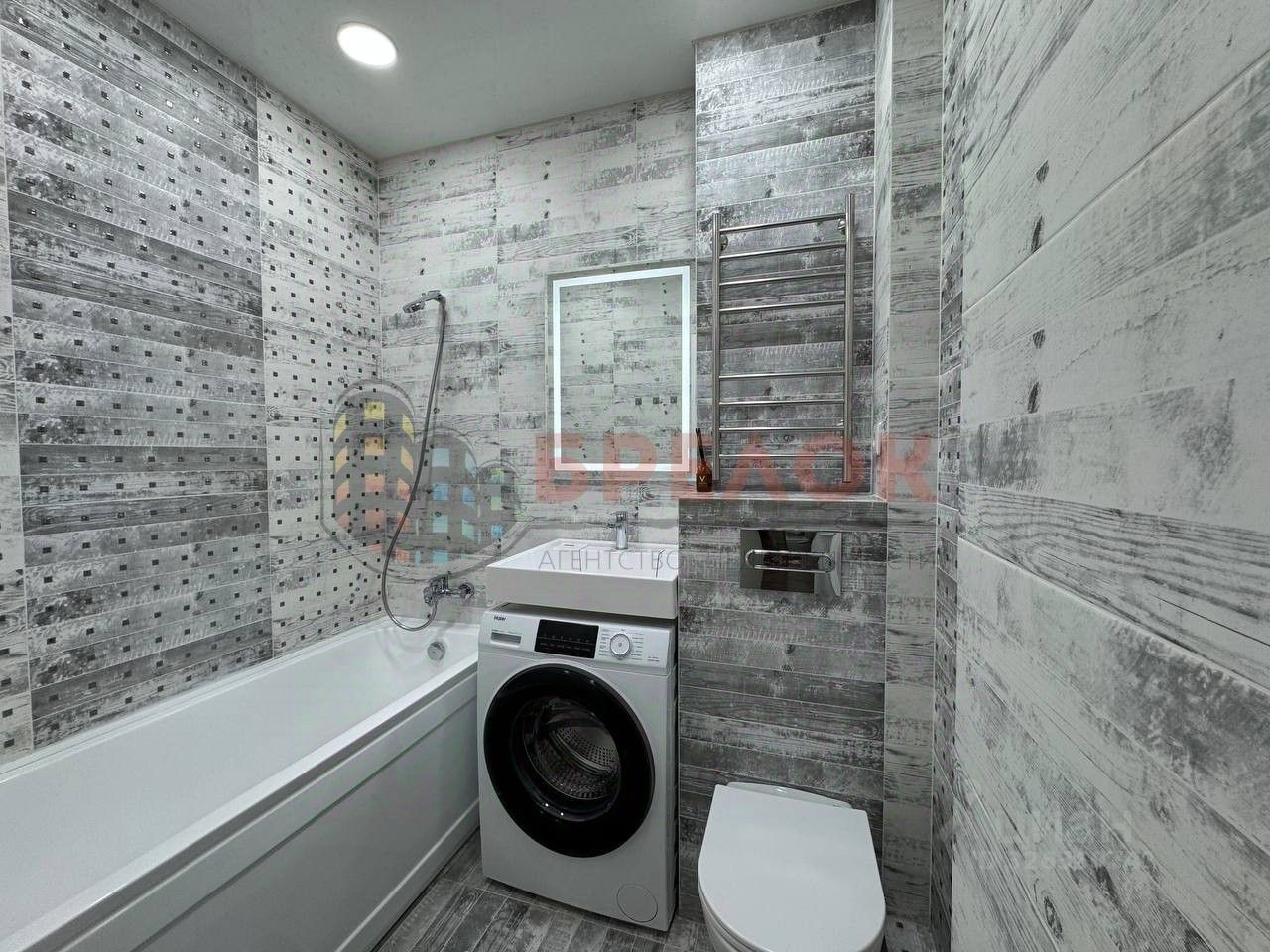 В ванной комнате установлена стиральная машина, электрический полотенцесушитель, качественная сантехника.
