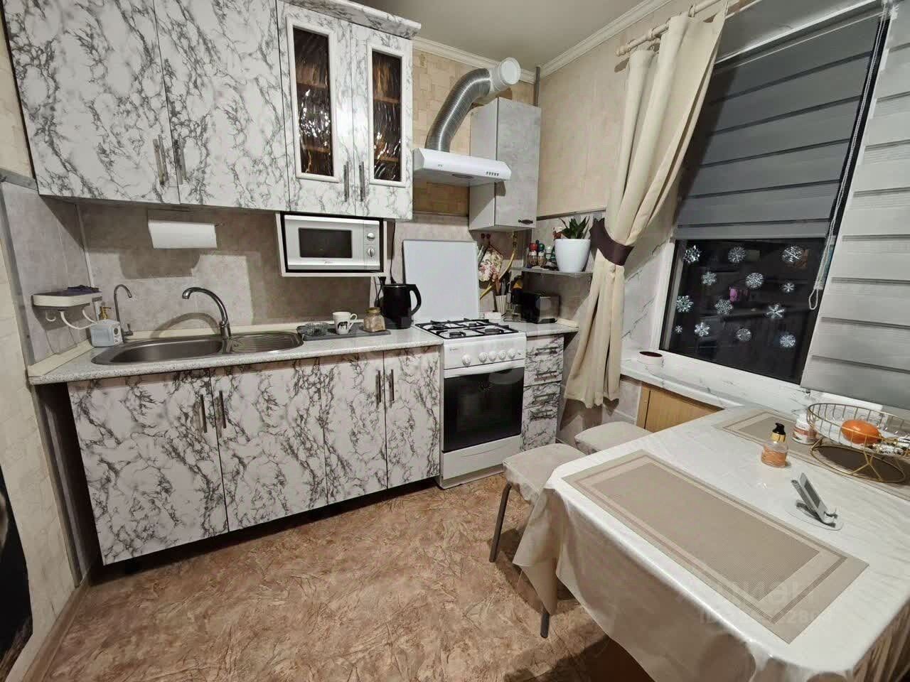 В комнате установлен вместительный шкаф-купе и удобный диван. Санузел совмещенный, оформлен плиткой, оснащён ванной и стиральной машиной. На кухне есть гарнитур, небольшой диван, стол и 4 стула.