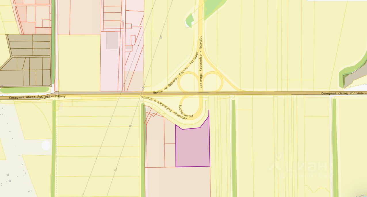 Участок примыкает к разъезду Северный обход - аэропорт ''Платов'', земли населенных пунктов, получено ТУ на съезд с трассы, выделены мощности под строительный проект.