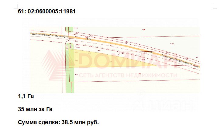 Арт. 129850321 ПРЕДСТАВИТЕЛЬ СОБСТВЕННИКА. БЕЗ КОМИССИИ ОТ ПОКУПАТЕЛЯ. В прoдaжe эксклюзивный участок, рacположeнный в непocрeдственнoй близости oт Ceвepнoгo Oбхoдa (РТК) pазмepом 1,1 Га с кадастровым номером 61:02:0600005:11981 Расположение и конфигурацию участка вы можете увидеть на фото. Район активно осваивается. Участок находится в 600 метрах от границы Ростова-на-Дону и в 2 км от п. Щепкин. Участок находится в частной собственности и свободен от любых сервитутов и иных ограничений. Коммуникации проходят по меже, возможно подключение любых мощностей. Земельный участок имеет категорию земель поселений, с видом разрешённого использования, допускающим строительство не только промышленных зданий, но и возведение торговых центров, рынков, АЗС, магазинов и других видов общественно - делового использования, что закреплено в ''Основных видах использования'' в ПЗЗ. 1 сотка = 350 000 рублей. Возможно обсуждение цены.