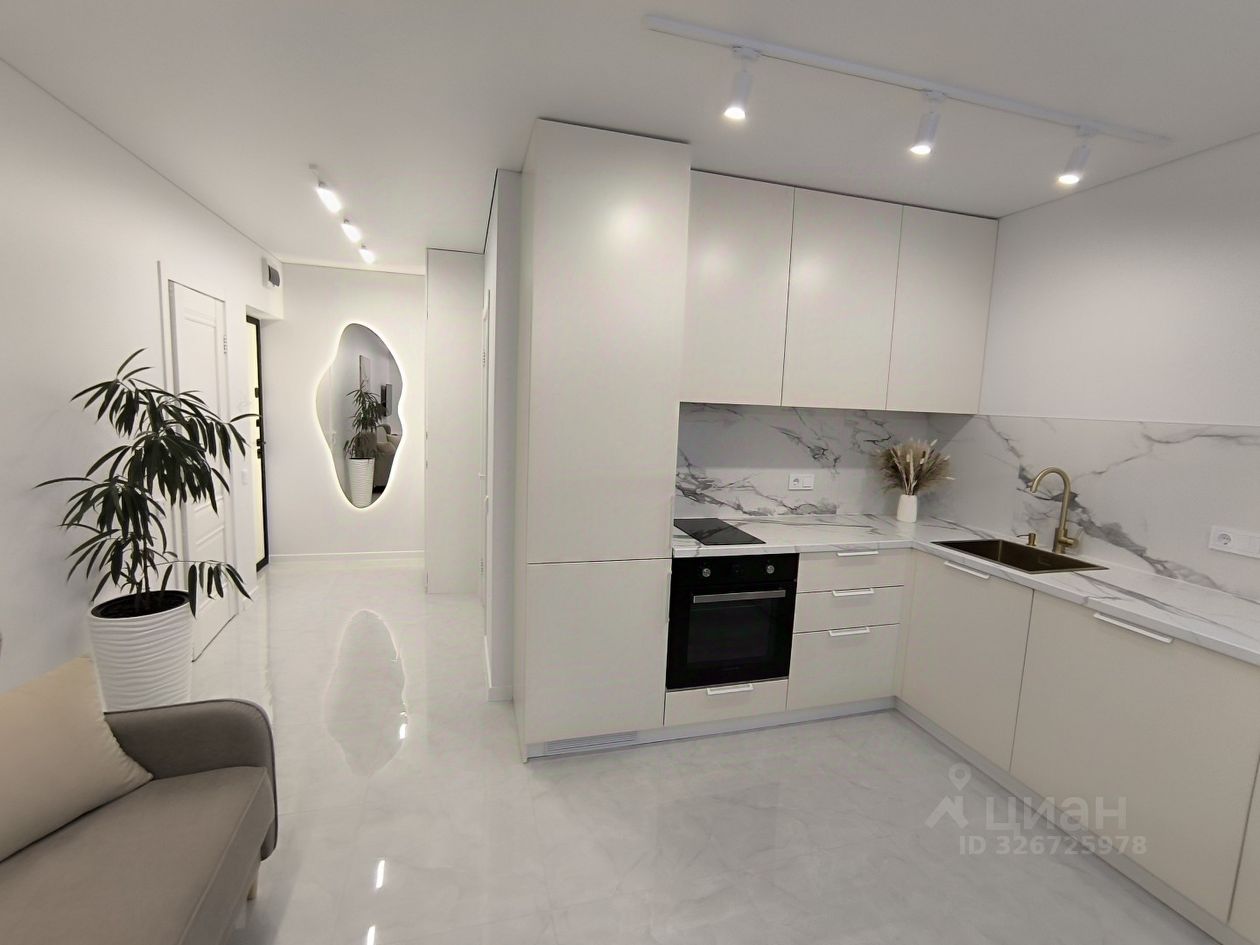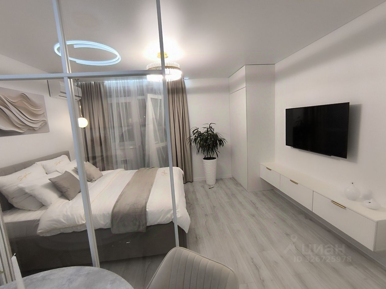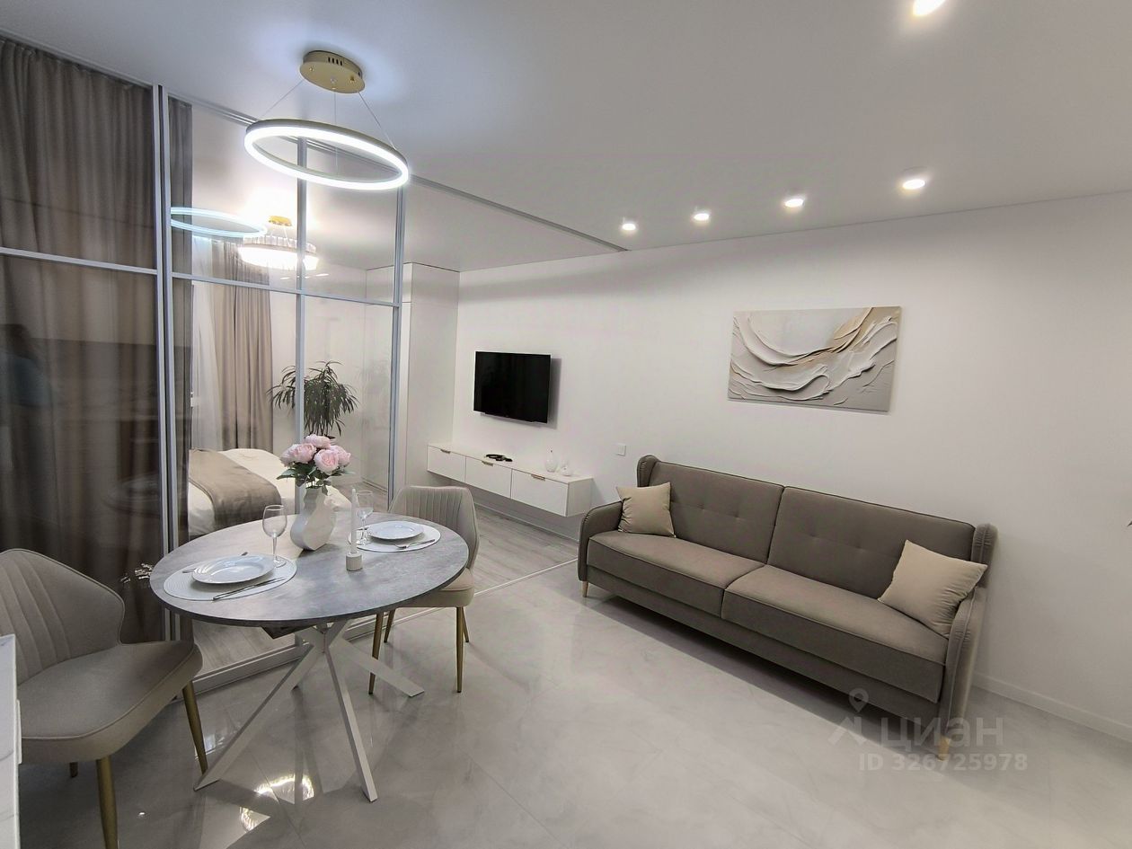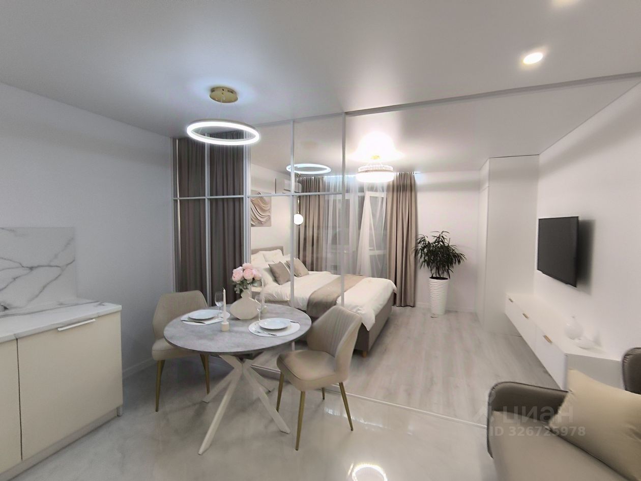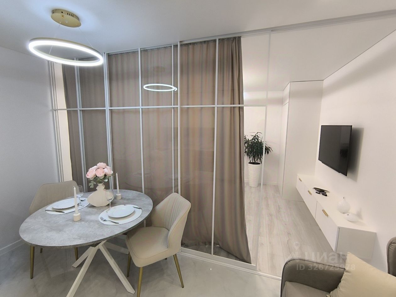 О квартире: . Ремонт и комплектация выполнены по дизайн-проекту. Планировка: Умное зонирование с помощью раздвижной перегородки разделяет пространство на две зоны: Спальная зона: Вместительная кровать с подъемным механизмом, зона ТV и шкаф для одежды. Гостиная-кухня: Просторная светлая зона с комплектом современной встроенной техники, кухонным гарнитуром и большим раскладным столом для всей семьи. Дополнительное спальное место — раскладной диван.