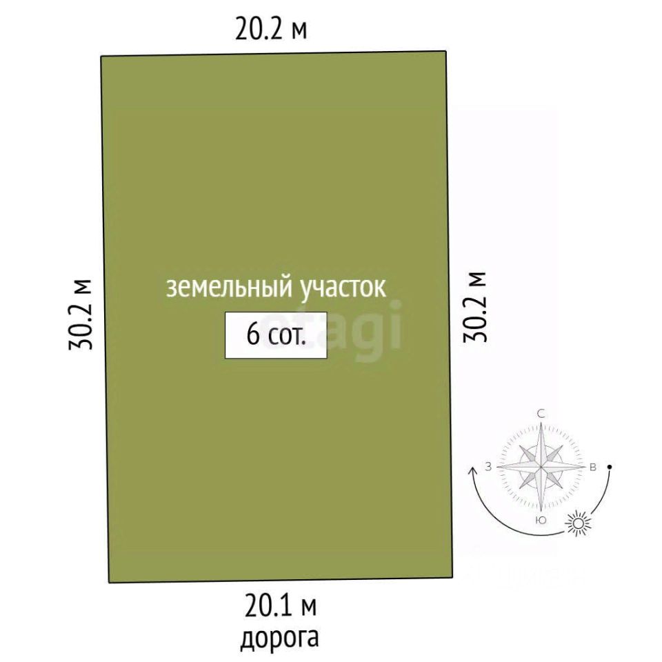 Фасад - 20 м Площадь - 6 соток.