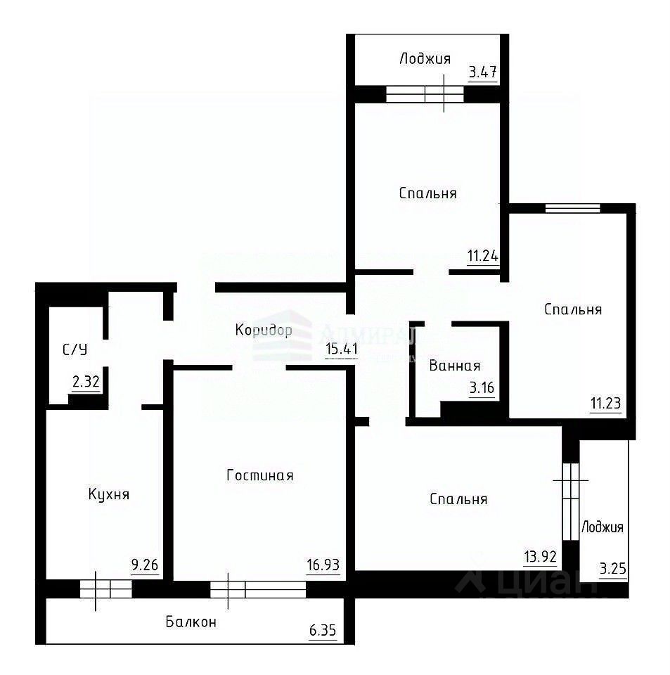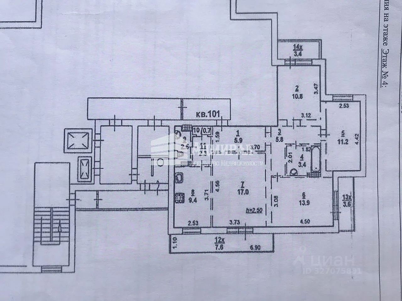 Общая площадь квартиры составляет 97.5 кв.м.