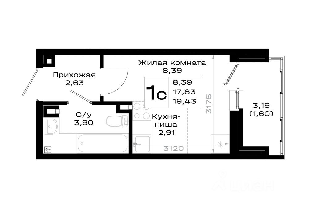 Общая площадь19,43 м2