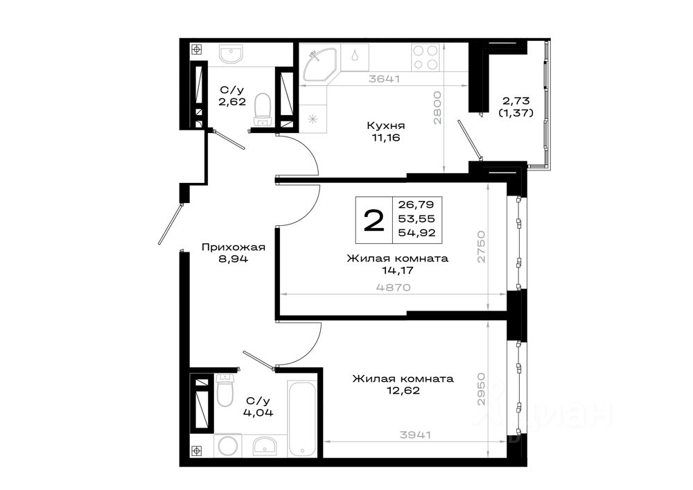 Общая площадь54,92 м2