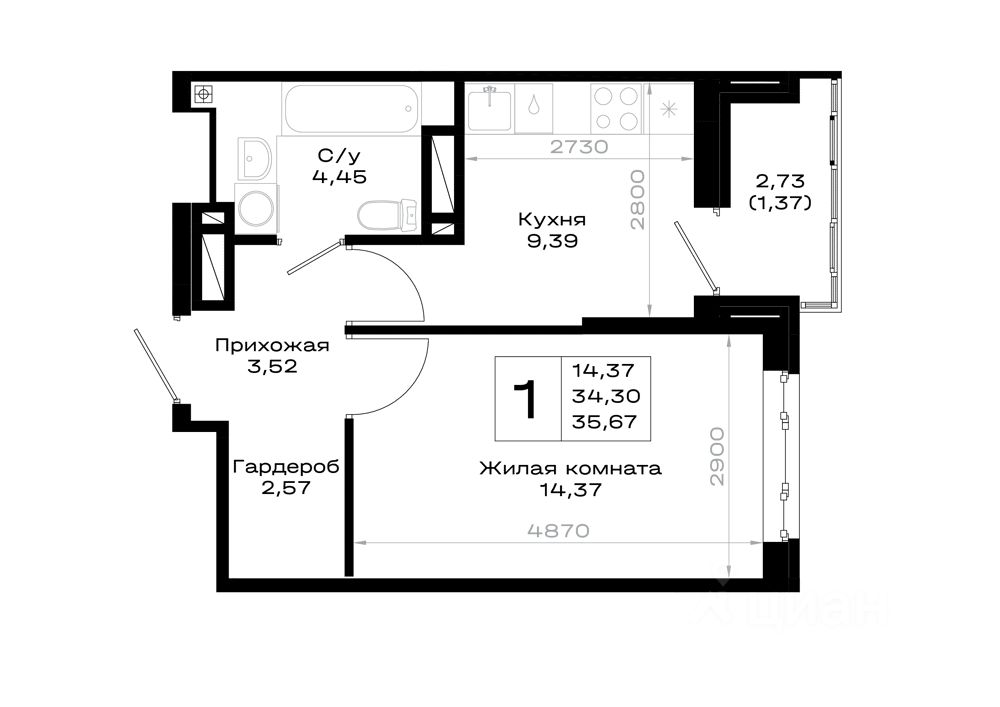 Общая площадь35,67 м2